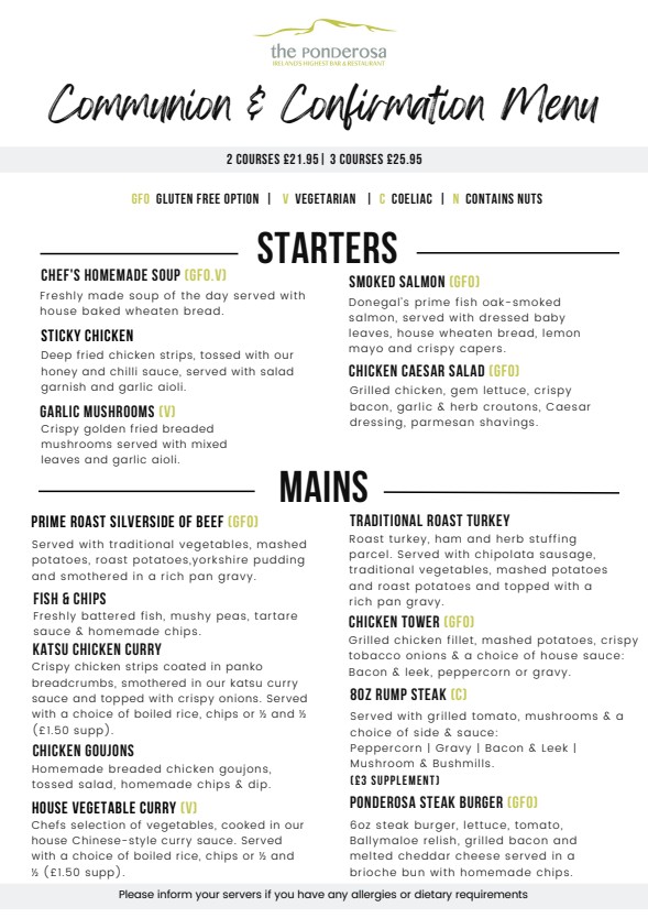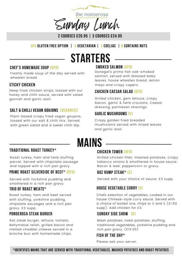 Our produce is always fresh and we use only the best local sourced ingredients. The menu is large and varied and offers traditional Irish cuisine, reflecting on the cultural diversity with a modern yet classical ambiance juxtaposed together to make The Ponderosa an unforgettable experience. All meat products suppied by McAtamney's butchers, Maghera.